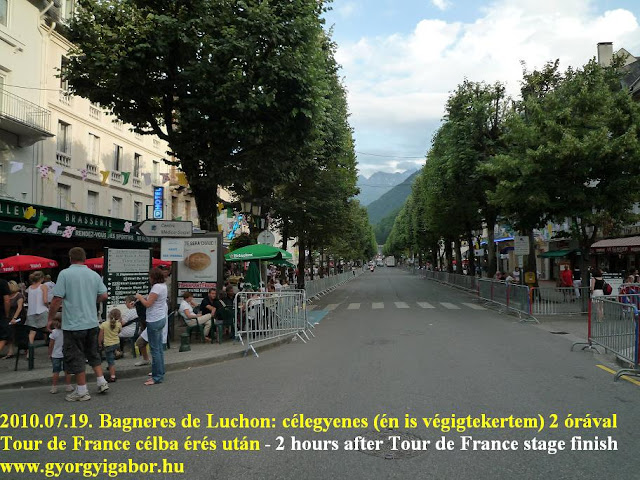 After a downhill again I cycled to Bagneres, the Tour stage finish of the day on a lightly ascending main road where I met with a lot of cars coming from Bagneres: I saw TV cars too. In the center of the town I saw the cordons of the finish street, on the sidewalk a lot of people were walking and the restaurants were full with visitors, fans.
