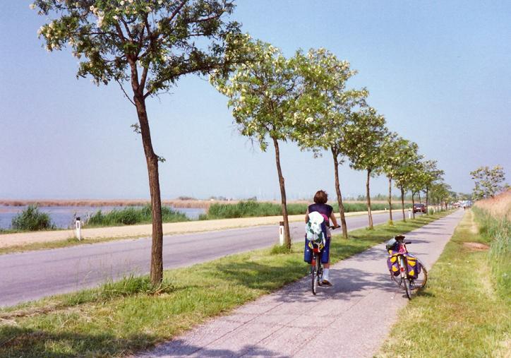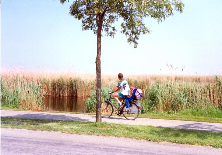 Az út jó minőségének köszönhetően 25-27km/ó-val haladtam. Weiden am See falunál meg sem álltam. Weiden és a tó névadó települése, Neusiedl am See közötti 2km-en a bringaút mindkét oldalról nádassal körülvéve haladt nem messze a vízfelülettől. A nádas fölött előrenézve jókedvvel figyeltem, amint a fejek nyugodtan haladtak, kanyarogtak a nádas fölött, alsóbb részük kerékpárt hajtott. Amint láttam a jó bringautakat és a sok bringást, a szép tájat, Nemzeti parkot, arra gondoltam, hogy barátaimmal milyen jó lenne ötösben megkerülni ezt a tavat.
