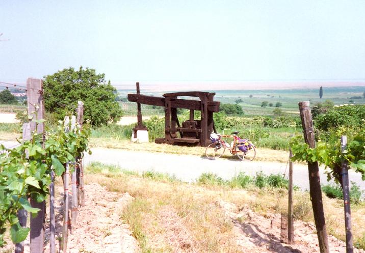 Hamarosan víz után kellett néznem. Mivel a Leitha hegység lábánál, Donnerskirchenben a térkép alapján kinéztem egy kis templomot; a tóra való rálátás reményében feltekertem oda. A szép templom környékét, virágok, zászlók, szép kovácsoltvas kút és egy szőlőmintákkal díszített kecske - amiből szintén víz folyt - valamint három sor fa ülőhely övezte. Jól megmosdottam a hideg vízben, lehűtöttem testem, majd az árnyékban nyugodtan elfogyasztottam következő két szendvicset. Felsétálva a templomhoz szép rálátást kaptam a Fertő-tóra, amin apró pöttyként vitorlások és szörfsök tucatjai örültek a szélnek. Mivel fel akartam tekerni a hegységet itt átszelő út kb. 400m magas tetejére úgy gondoltam, hogy visszafelé is megállok a kútnál. Amint elindultam a faluból kivezető emelkedőn, visszanézve magam mögött láttam a nádassal övezett Fertő-tavat és azon túl a Hanság már öszzefolyt az égbolttal. Utam nagyrészt közepesen meredek, de napos úton, csak néha hűsítő árnyékban haladt. A pedálokat nehezen taposva egyre jobban kezdtem izzadni.