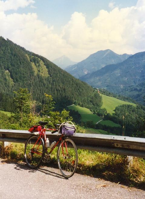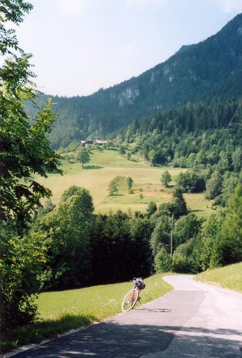 A várost elhagyva a teljesítménytúra legnehezebb szakasza következett: 150 km-rel a lábunkban 4 km-es 12 %-os emelkedőn feljutni az 1069 m-es Schiedsattelbe. Eleinte egy szűk szurdokban kanyarogva vezetett az út a zöld mezők közé, majd megkezdődött a megmérettetés. Hiába tekintettem hátra, nem láttam a komáimat; úgy tűnt eléggé lemaradhattak. Fél kilométert a csatornázás miatt felbontott út helyén, köveken zötyögve kellett megtenni; szerencsére nem lett kerékgondom. A hegy oldalában napos, keskeny erdészeti út vezetett egyre magasabbra. Küzdöttem: a legkevésbé a gyönyörködés foglalkoztatott, bár pár foto itt is készült. Ezt a meredekséget szoktam meg az elmúlt héten: Ausztriában rá kellett jönnöm, hogy csak Magyarországon léteznek 6-8 %-os emelkedők, itt bármelyik hegyre indul az ember, legalább 8-10 %-kal kell számolni. Útközben többször is megálltam fotózni; addig is pihentem. Bizony egyes szakaszokon alig bírtam: ki kellett állni a nyeregből. Menet közben az utolsó frissítőt nyújtó család hajtott el mellettem autóval, a kisfiú nagyon figyelte az erőfeszítéseimet.
