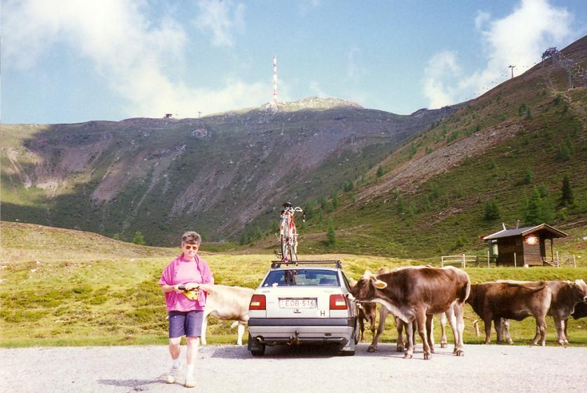 A lejtő kezdetén tábla jelezte, hogy 12%-os meredekségre és tehenekre kell számítani. Alig indultam el, már húztam is a féket, meg kellett örökítenem az egymás alatt megpillantott 4-5 hajtűkanyart, 10 km-es távolságban pedig egy hasonló szerpentines utat: fölfelé. Nagyon úgy tűnt, hogy kell még emelkedőre számítanom. Nem tellett sokba míg leadtam 400m szintet, és 1600m magasságba érkeztem. Eleinte kanyarokban haladtam, majd a végén hosszú egyenesekben száguldhattam 60-65km/ó fölött. A nagy sebesség után nagyon rosszul esett a lassú, kemény kapaszkodásba visszaesni, sőt már az emelkedő elején, egy rövid meredek, 10%-os szakaszon ki kellett állnom a nyeregből. Rosszul esett a hirtelen kezdés. A nemrég elhagyott tetőn még azt reméltem, hogy 15 órára fent lehetek, majd 16 órára a Goldeck tövében, de amint kegyetlen lassan, fáradtan pedáloztam, gyorsan szaladt az idő. Ezúttal a hegymászást a vörösfenyők és a törpefenyők közül kezdtem. Pár kanyar múltán már tehenekkel is találkoztam az út menti pázsiton. Nagyon tetszett a táj: jobban, mint az előző emelkedőn. A hegymászás nem is zavart volna, hiszen mindig örülök, ha erősödöm, de ezúttal sietnem kellett volna. Míg én az idő múlása miatt idegeskedtem, a tehénkék békésen legelésztek a fűben.