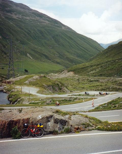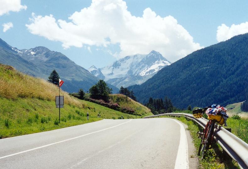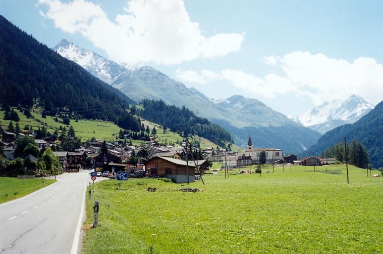 Lankás hegyoldali, füves emelkedőn fogyasztottam a kilométereket; az utolért csomagos srác - miközben filmezni álltam meg - mohón hajtott a szikláról ömlő vízesés mellé; azzal hűsítette magát. Nagyon hiányzott az árnyék; a saját levünkben fürödtünk. Miután én már legalább 5-7 éve nem vetkőzöm félmeztelenre, ezúttal sem tettem; nem akartam testemen is leégni. A következő falu, az 1346 m magasan található Liddes-t csodálatos táj övezte: ahogy megpillantottam, menten lenyűgözött. A fenyvesek és mezők közt takaros házikók; és a havas hegyek is mind közelebbről szolgáltak szép hátterül. További lankás út vezetett az 1633 m magasan fekvő Bourg St Pierre-ig, ám e település végén - akkor még nem tudtam - már az Olaszországba vezető alagút kezdődött. 6 km-rel fentebb, 1930 m magasságban, a duzzasztott tó végében, erről ágazott le a hágóút. A település végén örömmel hajtottam az árnyas és kellemes hőmérsékletű alagútba. Minthogy jobb oldala nyitott volt, a teljes kilátásról nem kellett lemondani, ám legalább megszűnt a szinte elviselhetetlen forróság, izzadás.