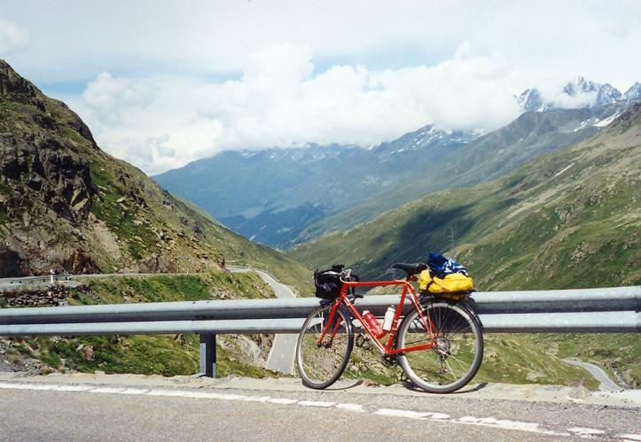 10 órakor értem Martignyba, ahol jó érzés volt, hogy már ismertem az utat. Ismerősként és meghódítottként néztem a Forclaz hágó, szőlősorok közt induló szerpentinjét. 10:13-kor értem a Grand Szent Bernárd hágóút kezdetét jelző táblához, mely természetesen offen / aperto -t jelzett. Innen, Svájc harmadik legmagasabb hágójának tetejéig 43 km emelkedőn 2000 m szintemelkedés várt rám; soha ennyit még egyfolytában nem mentem fölfelé. Természetesen e túra előtt is készítettem időbeosztást, hogy tudjam mihez tartani magam, eszerint Martigny-t 10:45-ig, Orsierest, fél órás étkezés után 1 1-kr kellett elhagynom; az 1920m magasan fekvő nagy duzzasztott tóhoz - ahol a főút és a hágóút is ketté válik - 14:15-re terveztem érkezésem, továbbhaladásom, míg fél órás tartózkodással kalkulálva a hágót 15:30-kor terveztem elhagyni. A 2469 m magas nyeregtől másfél órás gurulással számoltam Martigny-ig, onnan újabb egy órás pedálozást Monthey-ig, ahová apuékkal 18 órára beszéltük meg a találkozást. Pontosítok! Abban állapodtunk meg, hogy 18 óra előtt nem fordulnak a haza vezető emelkedőre, így ha időben nekivágok, menetközben érnek utol és vesznek majd fel.