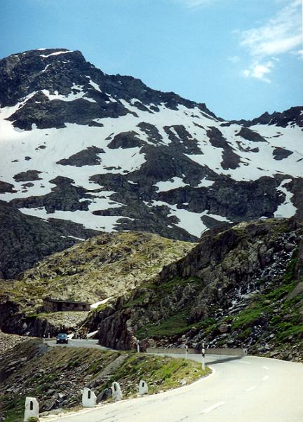Az első kilométeren nagyon óvatosan vezettem, fékeztem. "-Vizes úton, függőleges sziklák oldalában, hajtűkanyarok között: életveszélyes lehet!"- gondoltam. Kb. 1-2 km-rel a hágó alatt még egy, az eső miatt a hófoltból letört hódarab is került az útra. A 3 km-es sziklák közt vezető veszélyes szerpentinutat elhagyva, a lankásabb és kevésbé kanyargó mezei részen már 50 km/ó fölé merészkedtem. Sajnos egy lakóautót utolérve hiába mehettem, menekülhettem volna gyorsabban az eső elől, előzésre nem volt lehetőségem. Mivel a lakóautó 50 km/ó-s sebessége kevés volt, 2-3 km-t gyakori fékezések közepette kellett megtennem, míg végül a fedett alagútba nem értem. Útközben többször azon vacilláltam, hogy vajon míg az alagútig elérek, ezen 3-4 perc alatt a kormánytáskában mennyire ázhat el a videokamera; megálljak-e nylonba csomagolni, vagy kibírja-e addig? Győzött a lustaság és az optimizmus.