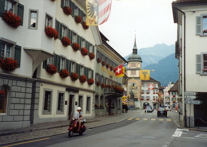 Az Altdorfig hátra levő 16 km-en az út ugyan a tóparton, ám a vízszint fölött kb. 100m-rel vezetett, hiszen a tavat végig magas sziklafal kísérte. A nagy forgalom miatt többnyire a járdán vezetett kerékpárúton pedáloztam. Ahol az autósok alagútban hajtottak, a bringásokat többnyire a régi út kis alagútjába vezették, nagyon vadregényes volt; ezen az alagutakban csak kerekesek járhattak. A tó vége felé mind jobban hűlt a levegő, már egy kevés napfény sem érhetett, hiszen a túlparti hegyek annál magasabbak voltak; hosszúujjút kellett húznom. Altdorfba érve (19:00) a felhősáv - ahogy reméltem - dél felé vonult, a város a sok szép házával, a cégérekkel, virágos ablakokkal, zászlókkal lenyűgözött. A központban egy szobor hirdette a Tell Vilmos "story" városhoz való kötődését. Bár a város előtt láttam egy kemping előjelző tábláját, ám nem tudván, hogy ez a térképen jelölt-e, vagy az majd a városban, esetleg azon túl lesz-e, továbbhajtottam. Egy járókelőt megkérdezve, ő küldött vissza a már látott kempingbe.