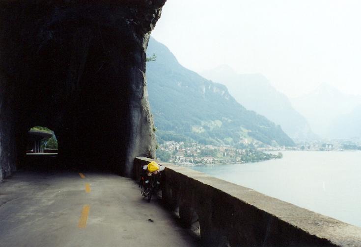 Minthogy 1/2 6 volt, ideje volt vacsorára valót vásárolni. Az út melletti kisutca "tüchtig" pékségében fél kg kenyeret és egy péksütit vettem; utóbbit azonnal meg is ettem. 2-3 km nyugati, felhő irányában való kerekezés után felüljárón fordultam dél, Altdorf és Andermat felé. A Vierwaldstatter See tópartjára értem, ismét. Brunnen városkában, a tóparton fantasztikus szállodák álltak, pálmafák és sok turista. Fölöttük szürke felhők, ám tisztán látszott, amint a felhősáv észak felé egyszer csak elfogy; okkal lehetett remélni, hogy a felhősáv estére dél felé elvonul. Órámra nézve - minthogy 18 óra felé járt - hiába is szerettem volna - be kellett ismernem, hogy sötétedésig már lehetetlenség az 1444 m magas és még 50 km-re fekvő Andermattba érni. Andermatt és Altdorf között kétséges volt, hogy akad-e majd kemping, így a 16 km-re, éppen a Vierwaldstatter See végében fekvő Altdorf-i kemping logikus választásnak tűnt, viszont ezzel az is egyértelművé vált, hogy altdorfi éjszakázásommal tudomásul kell vennem, hogy lemondok a másnapra tervezett három hágó túráról. A tóparton, magas sziklák oldalában vezetett úton pedálozva mind könnyebben barátkoztam meg az altdorfi éjszakázással. Az alábbi indokokkal érveltem Altdorf mellett:
