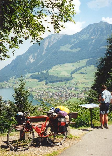 9 óra tájban kezdtem neki a Brünigpasson, Luzernen át Andermattig rám váró - a végső 35 km-en 1000 m emelkedéssel záruló - kb. 160-170 km-es napomnak. "-Amennyiben e napot sikerrel veszem, már utol is érhetem magam" - gondolkodtam - "hiszen másnap sort is keríthetek a Három-hágó túrára." A Luzern felé átkelést jelentő Brünigpass-ig előttem álló 45 km-es út első fele a Thuner See déli oldalán, míg másik fele, Interlaken után a Brienzer See északi partján vezetett. Az előbbi tó déli partján vezető út közvetlenül a hegyek lábánál, így reggel még árnyékban vezetett: csaknem fáztam. Minthogy 11 órától, az erősen tűző Nap alatt nem túl kellemes, izzasztó, tikkasztó meleg várt rám, így reggel még kifejezetten jól esett az enyhe hűs levegő. Az út szinte végig síkon vezetett, felerészt bringaúton hajtottam; pár kilométeren át egy sráccal versenyeztem. 10 órakor értem Interlakenbe. Bár szép emlék- és tájképek ugrottak be a városról, megállásra mégsem késztettek, hiszen még alig indultam el; korainak éreztem egy pihenést. Emellett ráadásul egész Svájc előttem állt még a következő bő héten, e nap pedig bizony eléggé sietnem kellett, ha Andermattba akartam érni. Szélcsendes időben folytattam utam a Brienzer See északi, napos partján. Az előbbi tóparti kerekezéssel ellentétben itt egyrészt már napon hajtottam, másfelől piciny buckák "kellemetlenkedtek". A napos tóparton néhol már fürdőzők érkeztek; kezdődött a fürdőélet. A csodás kék, tiszta tó déli oldalán magas, néhol havas hegyek tették teljessé a környék szépségét: készítettem is pár perc filmet. A tavat elhagyva 3-4 km-t még Meiringen 2-3km széles, teljesen sík völgyében hajtottam. 1 12-kor meleg napsütésben értem az 1007 m magas Brünigpass lábához. Két lehetőségem volt az Andermattba való átjutáshoz: míg egyik esetében Brienztől csupán 76 km-t kellett volna hajtani - igaz leküzdve közben a 2224 m magas Sustenpass-t - addig a másik az Alpok szélső háromezreseit megkerülve 160 km hosszú úton ér Andermattba. Minthogy csupán előző este kezdett talán (pontosítva: úgy tűnt, hogy talán rendbejött) rendbe jönni az utolsó 30*34-es áttételem, és valójában hosszabb emelkedőn még nem is tapasztalhattam, ezért kockázatosnak tartottam volna így nekivágni a Sustenpass 27 km-es emelkedőjének. Maradt tehát a könnyebb, de jóval hosszabb luzerni kerülés.