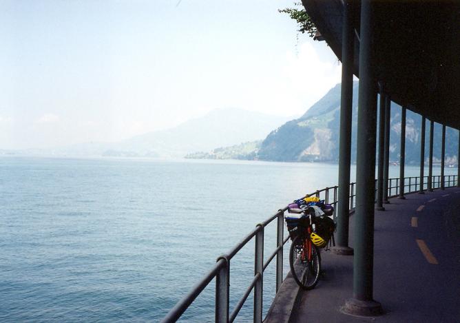 A Sarner See végébe, Sarnen-be érve okkal éheztem meg; órám 1 2-t mutatott és reggel óta alig ettem. Az utolsó 10 km-en már folyamatosan csak kút után járt a szemem, mert a hőségben bizony megszomjaztam. Sarnenben egy út menti sétányban kutat és mellette árnyas padokat is találván ideális ebédelőhelre leltem. Nem zavartatván az út kocsiforgalmától és egy-két elsétáló gyalogostól, ölemben megterítve szeltem a kenyeret, kolbászt, konzervmájast, budakalászi almát. Jóízűen falatoztam. Sarnent elhagyva sík úton folytattam a pedálozást; már a völgy széli hegyek is alig érték el a 2000 m-t. Pár kilométeren át ugyan az eső csepegni kezdett, minthogy azonban pár kilométeres erős pedálozással kiértem az eső alól, még azt is mondhattam: jól esett! A Vierwaldstatter See partjára érve végre már közel érezhettem magam Luzernhez. Minthogy a közelben autópályák futottak össze, Luzernig is már csupán 9 km-t kellett megtennem; az úton - nem meglepő módon - nagyra nőtt a forgalom. Az egyik tóparti részen nagyon élveztem a bringások széles, az autók mellett, félalagútban vezető bringaútját; melynek sávjait oszlopsor választotta el; széléről a tóra csodás kilátás nyílt.