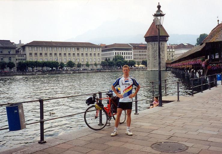 Az utolsó 3-4 km-t Horw-on keresztül megtéve, 15 órakor - 103 km-rel a lábamban - érkeztem Luzernbe (434m). Jegyzetlapomra vésett tervemhez képest egy óra hátrányban voltam, ám nem érdekelt, nem hagytam, hogy elvegye a bringázás örömét, hogy átrohanjak a szépségeken. Nem törődve azzal, hogy meglehetősen sietnem kellett (volna) ahhoz, hogy sötétedésig, 9-1/2 10-ig az andermatti kempingbe érjek, inkább élveztem a luzerni tópartot, a virágos fahidat, a hattyúkat, a templomot, egyéb szép épületek szépségét, a város nyüzsgését, forgalmát. Talán azért, mert így alakult, de nem éreztem hiányát, hogy nem néztem be a sétálóutcába és nem töltöttem pár órát a városban. Csak 1 - 3 órát szántam a híd közeli kis sétára, filmezésre.