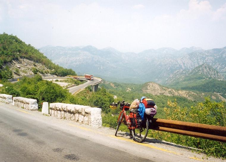 Nemsokára feltűnt végre a tetőt előjelző felfestés: még 1 km a BC - gondoltam, hogy a tetőről van szó. 64 perc alatt tettem meg a bő 10 km-es, kb. 6,2%-os emelkedőt; még a 10-es átlagos sem értem el. A tetőn érdekesmód erdőbe értem; a déli oldallal szemben, a hegy északi oldalát lombos erdő borította. A várva-várt lejtő első 2-3 km-e alig lejtett, sőt egy-két rövid szakaszon még emelkedett is; mérges is lettem. Kb. 3-5 km után végre már igazándiból lejteni kezdett. Újabb kilométer múlva az út kiért a hegyoldal szélére; hajtűkanyarokban tekergett szinte maga alá, miközben majdnem folyamatosan lehetett hallani a kamionok fékezését, vagy küzdelmét fölfelé. Észak felé - amerre tartottam - a hatalmas Skodari tóra (Skarad See) nyílt szép kilátás, ÉK felé pedig az igazi fekete, sötét színű hegyekre. Nem véletlen hívták Montenegrót a Fekete hegyek országának. Bár egy útmenti vendéglőnél menetközben megtölthettem volna kulacsomat, emiatt nem volt kedvem fékezni. Nem is gondoltam, hogy a későbbiek miatt sokkal jobban jártam volna, ha megállok. Gornji Brceli házai után már lankásabb lejtőn, kb. 50 km/ó-val gurultam, hajtottam, amikor feltorlódott autósor miatt kellett megállnom. Az autók a szembülső sávban is megálltak, hamar kiderült, hogy miért. Az emberek kiszálltak, hogy megnézzék, mi lehet az. Óvatosan én is előregurultam és