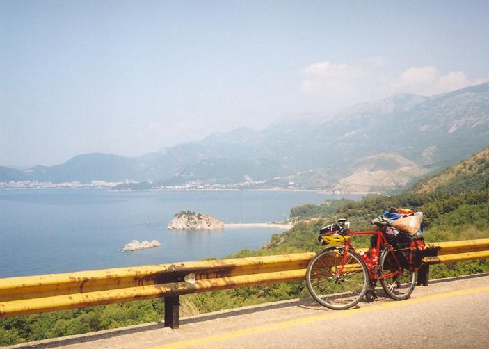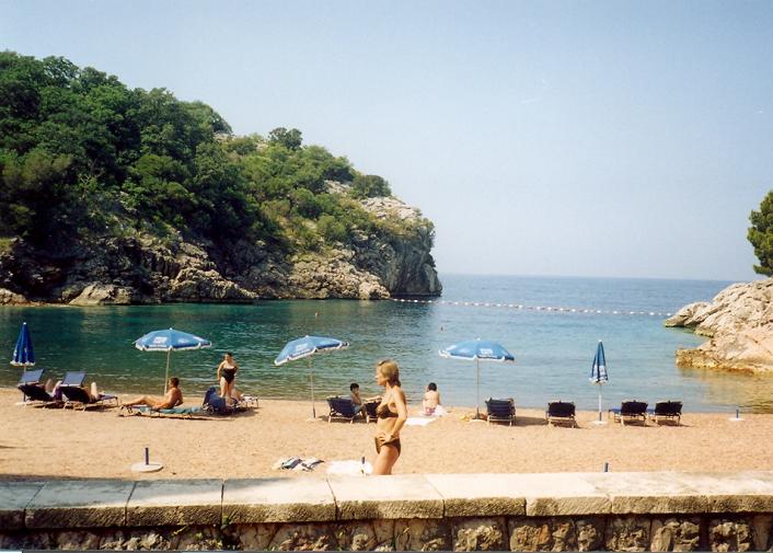 Bár Budvát elmúlt nap alaposan megízleltem, nem tudtam megállás nélkül áthajtani rajta. Az óvároson túl egy-két fotó kedvéért gurultam le a partra. Már reggel is sok fürdőző napozott a parton vagy lubickolt az Adriában. Petrovacig - ahonnan első hágóutam kezdődött - útközben több szép fürdőhelyet, látnivalót jegyeztem fel magamnak, ám esti, távoli sátrazásom miatt sok időt nem vesztegethettem; hosszú nap állt még előttem. 1 km-rel Budva után, Becicin is megkereshettem volna a parti szépséget, ám végül már 100 m-rel a lekanyarodás után vissza is fordultam. Pár kilométerrel később a Hotel Milocerhez és Sveti Stefanhoz lehetett lekanyarodni. Főleg az utóbbi miatt, ezt már semmi esetre sem akartam kihagyni.