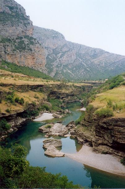 5 km múltán értem a szurdok kezdetéhez. A nap folyamán egymást érték a szépségek: az Adria csodái (pl Sveti Stefan) után jött a Skadar-tó nemzeti parkja, majd most a kb. 30-35 km hosszú Moraca-kanyon. Utam egy kis hídon kelt át a folyócska fölött; mellettem, alattam kb. 20 méter mély szakadékban, szurdokban folyt a tiszta vízű folyó, míg a másik oldalamon a hegyek szöktek - egyelőre még csak - 2-300 m magasba. Míg a szűk kanyonba nem értem, utam mellett kb. 8 km-en át akadt hely 1-2 km széles völgynek, mezőknek, elszórtan házaknak, kisebb földművelésnek. Ha az út néha a folyó sziklafala közelében haladt és leláttam a türkiz vízfelületre, párszor filmezni is megálltam. Újabb - emelkedő előtt szükségszerű - étkezésemhez egy eperfa melletti betontömböt találtam ideális helynek. Le is ülhettem, árnyékban is voltam