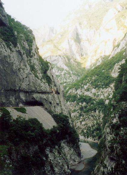 A sziklafalak között mind jobban összeszűkült a völgy, és az eddig jobbról kísért vasútvonal is eltűnt a hegyek között. A Nap - délután 4 óra után - gyönyörűen világította meg a keleti hegyeket, miközben én már árnyékban hajthattam. Alattam néha 100 m-rel zölden zubogott a víz, fölöttem akár 300-400 m magasabbra törtek függőlegesek sziklafalak, utam emellett mégis nagyon kíméletesen emelkedett. Ráadásul a korábbiakhoz képest a kamionforgalom is elviselhetővé vált: néha jöttek csak, így még a kerekezést is lehetett élvezni. Ennél szebbet kívánni sem lehetett volna. A szűk szurdokvölgyben egymást érték a 30-100 m hosszú alagutak, ám lámpát csak a hosszabbakban gyújtottam. Ott valóban szükség volt saját fényre is, ha - 15-18-20 km/ó-s sebességemmel - nem akartam egy-egy úthibába zökkenni. Sebességem kb. félútnál esett vissza kb. 15 km/ó-ra, onnan az út picit meredekebb lett. A Savnik felé történő leágazásig Podgoricától 49 km-t kellett hajtanom. Talán azért érezhettem, hogy tovább tart, mint hittem, mert nem gyorsan, meredeken tudtam le a szintkülönbséget, hanem lassan, alig észrevehetően. A szintkülönbség lassan fogyott, ám azt végig éreztem, hogy emelkedik. Mire kb. 35 km után kiértem a magas sziklafalak közül, már 1700-2000 méteres hegyek magasodtak közelemben. A Moraca fölött egy hídon átkelve - a szurdokhoz képest - szelídebb tájon folytathattam a tekerést. Már ? 7 elmúlt.