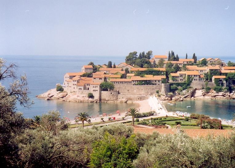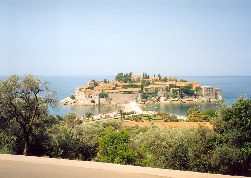 A Hotel előtt pár száz méterrel egy parkoló oldalából szép kilátás nyílt vissza a Budvai öbölre és a hegykoszorúra. Tábla jelezte, hogy a szép park bizony a Milocer Hotelé, ám ennek ellenére fizetség nélkül be lehetett hajtani. Erdőben gurulva értem az interneten látott - kizárólag a hotel vendégei számára használható -, sziklák által határolt öbölbe. A sziklákon fenyők álltak, a víz pedig kék-zöld színben hullámzott! Gyönyörű volt! Az utacskán továbbhajtva kb. 30 m-es magasságból pillantottam meg a híres Sveti Stefan szigetét. A szigetet keskeny földnyelv köti a szárazföldhöz. A szigetet a 80-as években a világ 10 legjobb szállodája között tartották számon, a sziget ugyanis egy szálloda-sziget. Annak idején Naomi Campbell, Sylvester Stallone, stb. gyakran megfordultak itt.