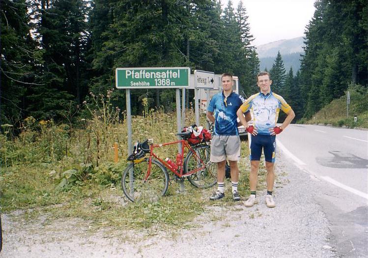 A túlgurulás - nem volt hamarabb leágazás - miatt még visszairányba kellett hajtanunk. Steinhaustól míg korábban 5-6 km-re vártam, az útjelzőtábla 10 km-re jelölte a hágót. Úgy tűnt, valamit ki kell húzni, kénytelenek leszünk kihúzni a tervünkből. Kellemesen meredek, barátságos, mezős, fák, virágos völgyben, csendes úton pedáloztunk. Ahogy a Semmeringre is, ezúttal is többnyire egymás mellett hajthattunk. Tamáshoz idomulva igazi edzőtempót hajtottunk; mondtam is neki: "-Csak óvatosan, tartsuk magunkat az én tempómhoz. Így is határomon tekerek, nem akarom túlhajtani magam, mert akkor nagyon csúnya vége lehet a túrának." Kb. 7 km után az út hirtelen meredekbe váltott; meg is álltunk egy rövid szusszanásra. A kaptatón utolsó fokozatomba váltva lassan lemaradtam a kiállva hajtani kénytelen Tamástól. A hátralevő kilométereken hol együtt, hol külön tekertünk; lassan, 10-11 km/ó körül. Szép fenyőerdőben vezetett az út, kilátás azonban nem sok nyílt. 14:45-kor értünk fel az 1372m magas Pfaffensattelre (foto).