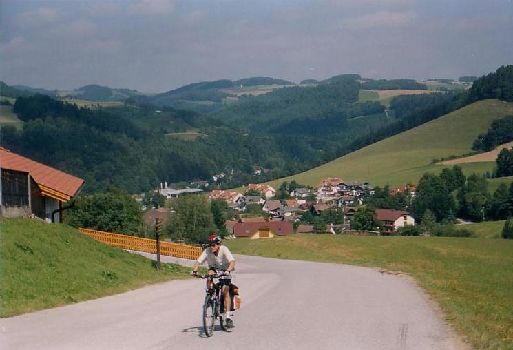 Kevés autó járt, így a fennsíkon egymás mellett hajtva néztük, honnan lenne legjobban lefotózni a teheneket, mezőket háttérben a szép hegyekkel. Ekkor dudált ránk egy autó. Nagyon élveztük a szép tájat. 2-3 km lejtőn gurultunk be a 417m magasan fekvő Kirchschlag ba (10:24), ahol végre jól esett egy kicsit leszállni a kerékpárnyeregből. A centrum elején egy szép festett ház kínálta magát fotózásra, a központban pedig végre egy igazi osztrák falut élvezhettünk rendezettségével, bájos üzleteivel, tisztaságával, virágokkal és egy szökőkúttal. A városkát elhagyva a Zöbern patak mentén 2-3 km-t kellett nyugatnak hajtanunk a wenzelangeri emelkedő leágazásához. Csendes völgyecskébe fordultunk; az út bal oldalán patak csobogott. Nem sokkal lefordulás után egy játéktörpés és kis vizimalmos háznál álltam meg fotózni. Ungerbach falucska végén megkezdődött a 780m magas - Niederösterreich térképen hágónak jelölt - Wenzelangerig tartó emelkedő. Egy újabb 10-12%-oshoz lett szerencsénk. A kaptató nemsokára nyílt domboldalon vezetett fölfelé, így kilátásunk is nyílt. A meredekség miatt, - mivel legnagyobb áttétele 39*21 volt - Tamás kénytelen volt kiállva hajtani, nem először és nem utoljára a nap folyamán.