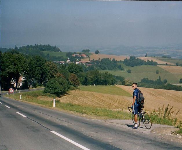 Számunkra kényelmes, 25-26 km/ó-s tempóval kerekeztünk Deutschkreuz felé. Krisz helyismeretének köszönhetően a kisvárost egy elkerülőutacskán kerültük el. Ahogy előző este mondta, a következő faluban be is tért osztrák zsömlét venni. Meglepve hallottam, hogy reggelire csak gabonapelyhet evett. Ezzel szemben én 3-4 karély kenyeret. Enyhén hullámzó úton, kisebb dombokon kerekeztünk nyugat felé; alul immár én is rövidben. Kellemes idő lett. Az utolsó 5-6 km-n 2*1 sávos autóútnak jelzett kocsiúton haladtunk, és hiába szóltak ránk, más út nem akadt, ráadásul úgysem sokat akartunk rajta kerekezni. Az É-D irányú 61-es utat elérve, 1 km-t délnek kerekeztünk és már fordultunk is nyugatnak, a Bucklige Welt hegyecskéi felé. Krisztiánnal megbeszéltük, hogy az első faluban, amint találunk megfelelő, pados helyet, megállunk, hadd reggelizzen meg. Közben Tamás feszegette, hogy mi lenne, ha Krisz reggelije közben felkeresnénk az este a térképen kinézett egyik "esetleg-hágót", a 780 m magas Wenzelanger passt. Mivel tele gyomorral nekünk a fél órás várakozás felesleges időpocsékolás lett volna, belementem, hogy 2-3 órára különváljunk Krisztiántól. Abban maradtunk, hogy legközelebb a - számunkra - Wenzelangert követő emelkedő közben, vagy tetején, a Hutwitsch melletti faluban Hochneukirchenben találkozunk.