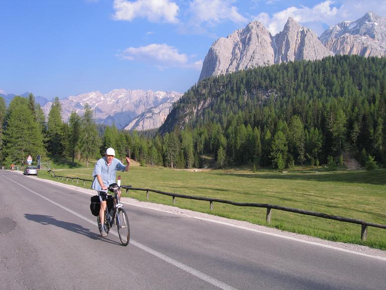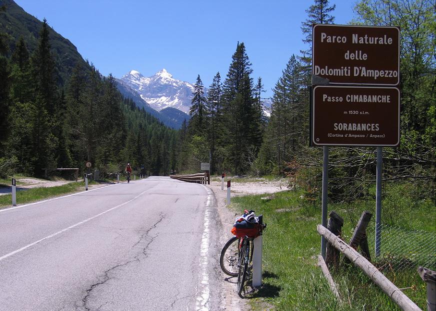Nagyon buzgott bennem az elszántság, ahogy máskor külföldön, most is sokat akartam a környékből bejárni, megismerni. Ahogy kiszámoltam, hogy balázsék – az autót Cortinában hagyva – mennyi idő alatt érnek majd a Misurina tóhoz, arra jutottam: belefér még a 3 km-re a másik irányba levő 1530m magas Cimabanche hágó is; legalább még egy kerülhet fel a listára. Fölfelé még úgy tűnt, közepesen meredek az út, ám visszafelé a 60 km/ó-s sebesség azt mutatta: meredek volt ám az! A hágóról csak enyhe kilátás nyílt nyugat felé. Schluderbachba (Carbonin) visszaérve azonnal fordultam is a Misurina tóhoz vezető emelkedőre. Kb. 6-7 km-re állt előttem 300 m szintemelkedés. Fordulás után nem sokkal, máris kb. 8%-os lett az út meredeksége, így az alig mögöttem fordult versenyző hamar meg is előzött. Az aktivitás, bennem levő "pörgés" miatt akartam is a nyomába szegődni, tartani a tempóját, így rá kellett parancsolni magamra: "-Gábor! Ne hajtsd ki magad feleslegesen; saját tempóddal haladj!" Így is tettem. Szép fenyőerdőben haladt az út; eleinte még csak imitt-amott kaptam kilátást egy-egy hegyre.