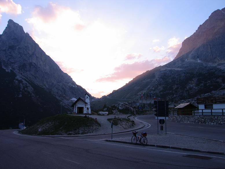 Ez már meredekebb volt, mint a Falzarego; lassan értünk fel. A tetőn Péter a lejtőre való beöltözésre készülődött: legelőször félmeztelenre vetkőzve lemosdott! Odakint lehetett vagy 12 fok, ő meg mosakszik, majd megtörülközik. ÉN a Falzarego hágóra visszagurulva öltöztem fel; el akartam csípni Balázst. Percek alatt mindketten felöltöztünk, majd lámpákkal bringáinkon jöhetett a száguldás, ereszkedés. Hogy lámpám látsszon, hátizsákom a csomagtartóról hátamra vettem. A kocsiig 10 km-t gurultunk, ám a végére lehűltünk.