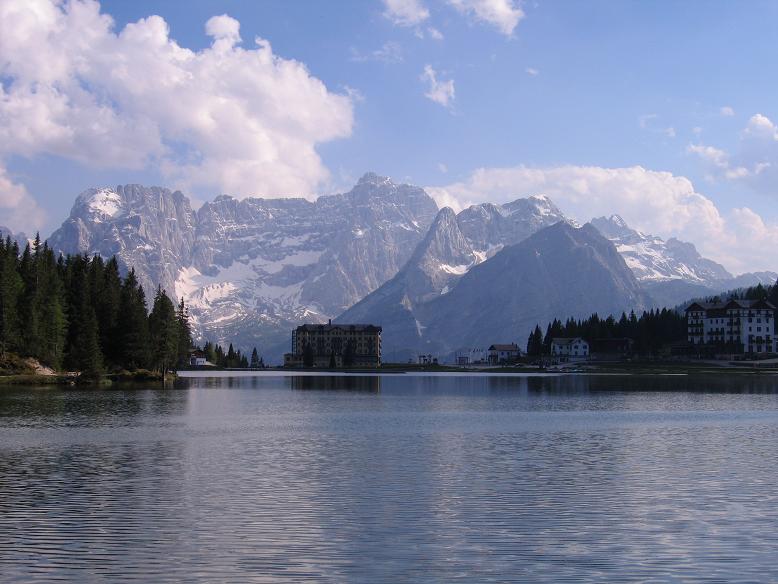 Szűk 2 km után lankásabb lett az út, és mivel szem előtt volt még a srác – nem bírván magammal – gyorsítva megpróbáltam beérni. Lábamon éreztem, hogy talán nem kéne kihajtani, megkínozni, de nem bírtam ellenállni. Az üldözősdi sikerrel járt, mert perceken belül már a háta mögött hajtottam. Próbáltam egy-két hanggal a tudtára adni, hogy ismét ott vagyok; nem tudom észre vett-e. Az út ismételt meredekebbé válásával vissza kellett váltanom, így az éles kanyarban ismét lemaradtam a srácról és mivel az út 10%-os meredekséggel folytatódott, ismét visszaálltam túrázótempómra. A hátra felé nyíló kilátás egy fotózásra, filmezésre is megállított; hamarosan azonban már a Misurina tó fennsíkjára értem. A hegyek mögül kibújva utam vagy egy kilométeren át síkon haladt. ? 3 volt; úgy saccoltam Balázsék is ezidőjárt érnek ide, bár mélyebben azt gondoltam, én érek majd hamarabb a tóhoz. Ahogy előrefelé nézve azt fürkésztem, hogy a látott leágazásnál indul-e az utunk a Drei Zinnen alá, az Auronzó turistaházhoz, Balázs és Péter tűnt fel. Meglepett, hogy ilyen gyorsak voltak, ám perceken belül kiderült a turpisság: még jóformán nem is tekertek, hanem helyette autóval érkeztek toronyiránt Toblachból. Állítólag már egy órája a Misurina tó környékén bóklásztak.
