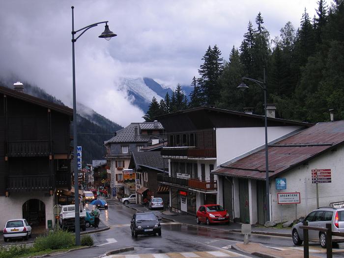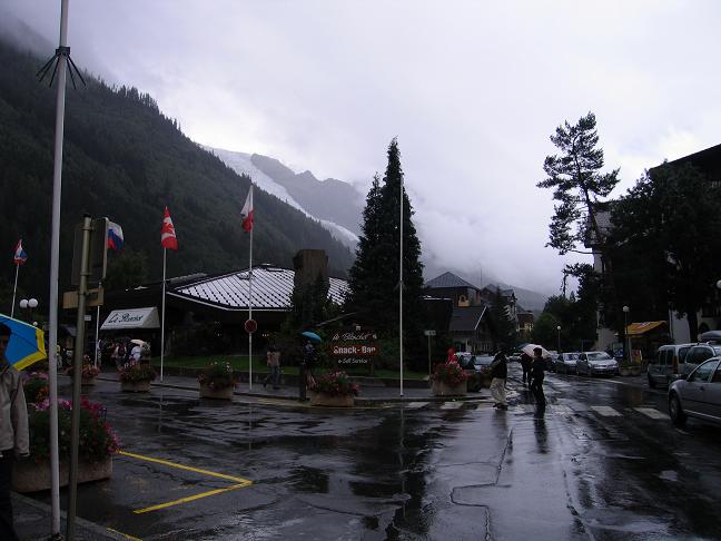 Szinte pontban délben kifizettem az éjszakáért a 18,2 EUR-t, majd szemerkélő esőben Chamonix központja, illetve Svájc felé kerekeztünk. Chamonix-ban az emberek kabátban, melegen öltözve, ernyővel sétáltak, vásároltak. Novemberi idő volt, 10-12 fok lehetett. Eredendően - csupán gyenge esőt remélve - úgy indultam útnak, hogy nem vettem fel az esőnadrágot és a kamáslit, ám a városközpontba érve kénytelen voltam engedni és felöltözni. Melegen beöltözve lassan hajtottam; nem akartam megizzadni, na meg ilyen országos esőben minek a sietség ?