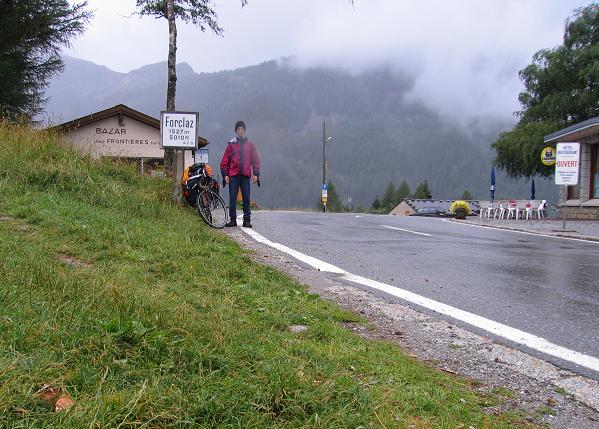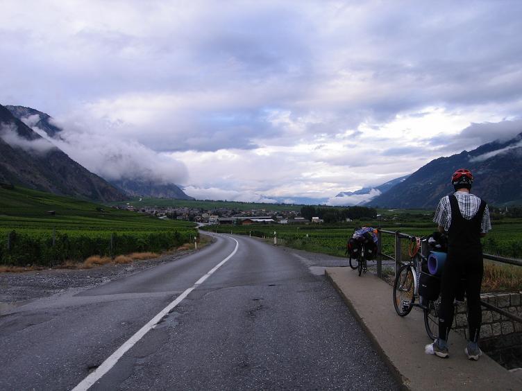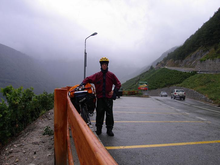 2001-es túrámról ismertem már a lejtőt: 7-9%-os meredekség, ám szerencsére csupán kevés hajtűkanyar állt előttünk. Fékjeim miatt óvatosnak kellett lennem. A gurulás során hamar ködbe, felhőbe értem; nem volt semmi! Trutyi, esős, ködös, hideg időben 40-50 km/ó-val gurulni, majd a vizes aszfalton a kanyarokat bevenni. Időben kezdett fékezésekkel a ritka forgalomban az utolsó előtti kanyarig nem volt gondom; ott azért volt kis izgulni valóm, hogy lelassulok-e a kanyarig. A város fölötti kanyarban meg is álltam, hogy visszafelé a felhőt, szürke tájat, a Rhone völgye felé pedig a világosabb, de még szintén esős időt megörökítsem. Újabb fegyvertény volt ilyen időben átjutni a két hágón. (Három nap múlva persze cudarabb időben még komolyabb teljesítményt vittünk véghez.)