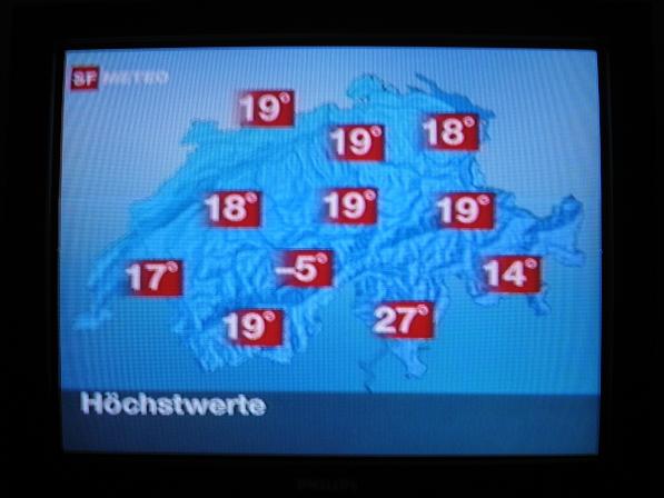 Persze hamar bekapcsoltam a TV-t, hadd lássuk a legfontosabbat: szép időnk lesz másnapra? Mi várható a következő napokban? Nem volt okunk örömre: bár napsütést, délutánra záport ígértek, hőmérsékletben Wallisra csupán 19-21 fokot. A hóhatárt 2400m-re jelezték előre; azaz éjjel ott hóesés is lehetett. Melegedést keddtől ígértek.