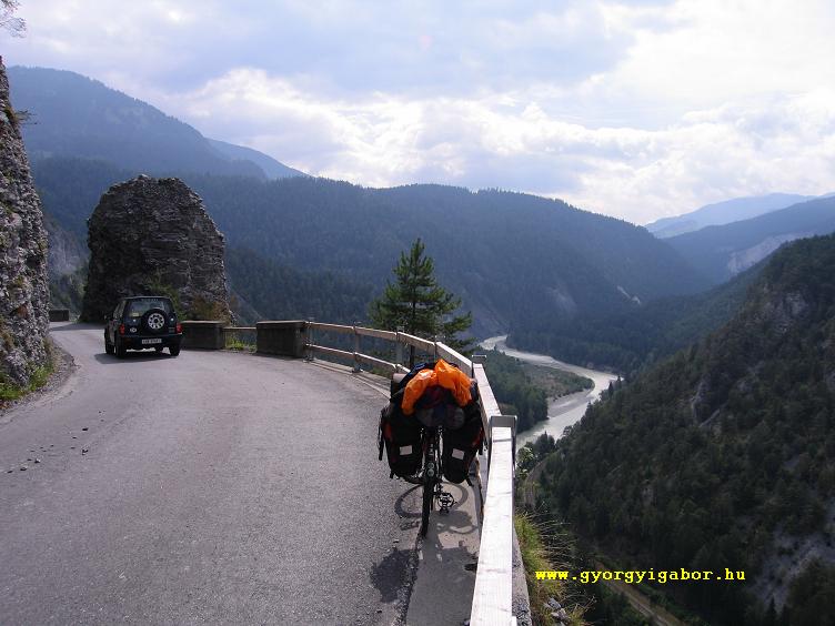 Thusis felé enyhe hullámzással haladt az út; akadt pár kilométernyi lejtő, de emelkedő is; összességében jól haladtam; és az időt is jobbnak, melegebbnek, derűsebbnek éreztem. A kisváros előtt egy parkolóban félreállva töltöttem fel energiakészleteimet, hogy bírjam a várost követő emelkedőket. Erre is jártam már korábban (2005), akkor ellenkező irányban gurultam; érkeztem a San Bernardino hágóról. Közepes meredek emelkedőn hajtva érkeztem a Via Mala szurdokba, a 3-400m magas sziklafalak közé. Itt még jobban bírtam erővel, ám pár kilométerrel feljebb a Rofaschluchtban már nehezebben küzdöttem meg a meredekséggel. A Via Malából kiérve a völgy kicsit kinyílt, az út is engedélyezett pár sík kilométert. Andeer (981m) végén újabb rövid pihenőt tartottam; müzliszeletet és csokit falatoztam. Péternek hiába küldtem újabb sms-t, válasz nem érkezett; azt sem tudtam, merre jár, ha egyáltalán halad. A Rofaschlucht emelkedője lankás szerpentinekkel, majd 8-10%-os meredek résszel folytatódott; néha a nyeregből is kiálltam. Egy szakaszon - nem értem miért - relatíve elég nagy forgalom haladt, pedig az utamról még láttam is az autópályát, amit inkább ajánlottam volna az autósoknak. Érdekes volt, hogy az út mellett hosszan annak széléhez rögzített, a levegőbe logó vasrudakból álló "járda" lógott, melyen a turisták korláttal védve nézhettek a lábuk alatt / mellett zubogó víztömegre.