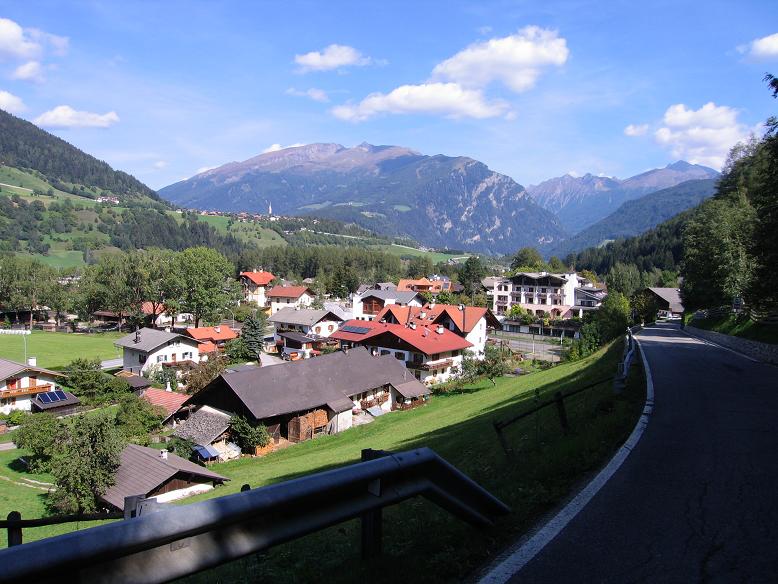 Sterzingben megtöltöttem kulacsaimat, majd jöhetett utolsó olasz alpesi, 2000m feletti hágóutam, a 2094m magas Jaufenpass / Passo Monte Giovo. Árnyas fenyőerdőben 8%-os meredekséggel indított; a folytatásban is 1-2 km-nként akadt csak kilátás, közte erdőben haladt. Szép volt a völgy: itt-ott falvakkal a hegyoldalban; a völgyben zubogó patakkal. Érdekes, hogy a hegyek és a völgy hangulatilag a szomszédos Timmelsjoch hágóutat idézték; ez is, az is nagyon tetszett.