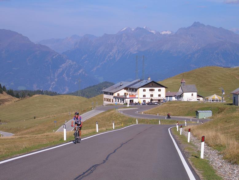 Az erdőből kb. 11 km után, kb. 1800m-en értem ki; feltárult a hágó környékének látványa és a szél is elkapott; szemből! Hűvösebb lett, a szél miatt éppen csak elég volt a rövid mez. Kopár, nem túl meredek, legelős hegyoldalak voltak a környéken, fent azonban már sziklásan zárultak a hegyek. Kb. 1-2 km-rel a hágó alatt pár ház, vendéglő és egy kápolna állt. A házakat elhagyva éppen egy közeledő bringást fotóztam le a szép tájjal a háttérben. Itt sem és a hágóra érve sem siettem, kevéssé zavartattam magam a Brennerről induló vonat idejével: "-Ha picit le is késem, bő óra alatt nem sokkal 20 óra utánra le tudok majd gurulni Innsbruckba" - gondoltam.