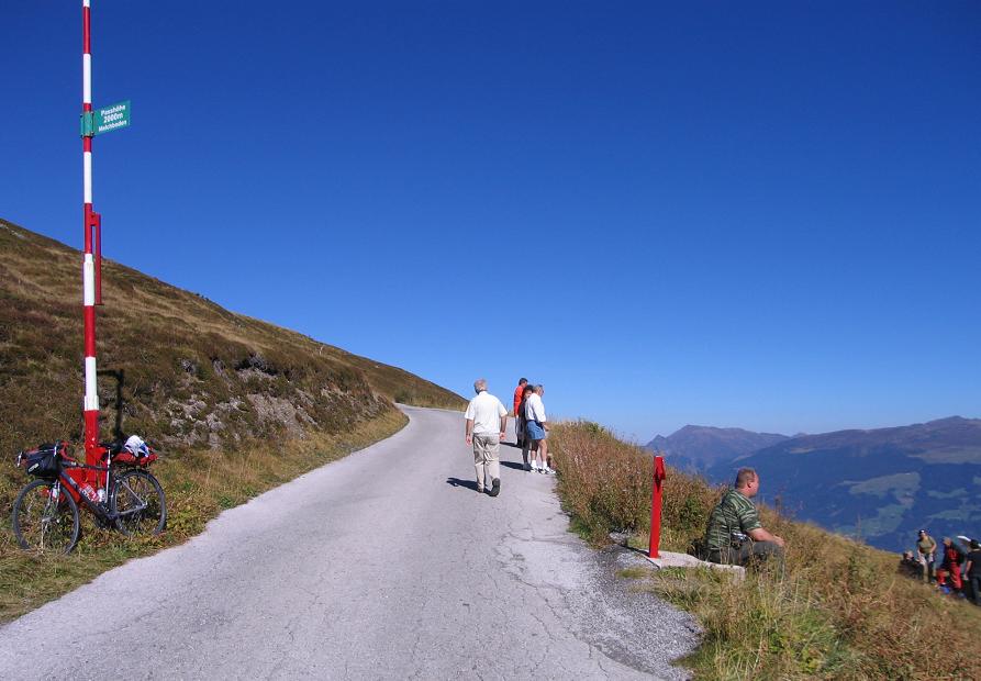 Egy lankásabban emelkedő szakasz után ismét meredekebb kilométerek következtek, néha kilátást engedő fák között. Egy eddig nem látott hegyekre, egy belső katlanra, hegysorívre nyíló kilátás hamar megváltoztatta a véleményem. Látszott, hogy utam arra vezet; egy-két épület, valamint úton haladó autók is csillogtak a hegyoldalban; fentebb pedig egy nyereghez is mintha út vezetett volna. 1:250000-es térképem sem néztem meg, így nem jöhettem rá, hogy az a nyereg nem lehet az általam keresett hágó; így viszont azt hittem: talán ott lesz az utolsó alpesi 2000m feletti hágóm, és a továbbmenetel mellett döntöttem. Lemondtam a 13:50-es jenbachi vonatról; a következőig plusz 2 órám volt még, igaz sejtettem, hogy Bécsbe érve e nap már nem jutok át Magyarországra; vagy legalábbis kicsi az esélye. A hágó mellett és minden bizonnyal a csak másnapi hazaérkezés mellett döntöttem. Az emelkedő kb. 1800m-es magasságig még 12%-os meredekséggel kapaszkodott - fotózni azért megálltam - utána már lankásabb szakaszon érkeztem a vendéglőhöz, ajándékbolthoz. Utóbbi több klassz dolgot is árult, de igazán tetsző ajándékot mégsem találtam. Beértem egy részletes térképpel, amiről legalább minden kiderült a további útról: kb. 1,5 km még meredeken fordul a szomszéd hegyre, ám onnan, a sarki kilátóponttól még kb. 2-3 km lankás emelkedő a 2015m magas tetőig. A vendéglő 1840m magasan volt.
