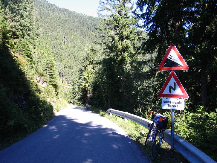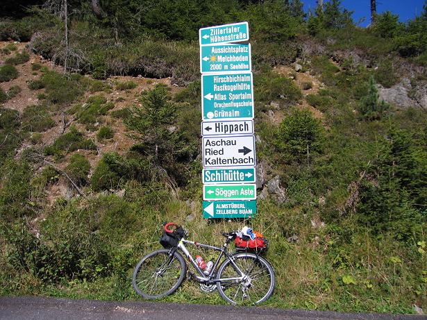 Bár nem volt szűk völgy a Zillertal, és a keleti oldali hegyek is csak 2000-2500m magasak voltak, a Nap még így sem emelkedett föléjük, így többnyire árnyékban, hűvösben hajtottam. Nem ízlettek a piciri buckák, emelkedők, mert nem tudtam elég lendületesen haladni. Pici feszültség is "dolgozott" bennem, mert szaladt az idő: 8:30, 8:40 volt. Közben persze azt is nézegettem, hogy hol tehetném le a málháimat. Egy kempingnél a recepció még nem nyílt ki, Uderns falu mellett pedig útépítés állított meg és idegesített fel. Türelmesen vártam kb. 3 percig, hátha engedik szemből a forgalmat, ám semmi… Nézegettem az út túloldalán haladó mellékutat is, hátha el lehetne ott menni, de nem láttam jól. Türelmetlenül vártam, majd kb. 7-8 perc után betértem a faluba, ahol kis utcákon sikerült továbbhajtanom. Egy főúti felüljáró előtt tábla jelezte jobbra a Zillertaler höhenstrassét, ami nemsokára Reid faluból ágazott le. Bosszantott, hogy még mindig nem találtam megfelelő helyet csomagjaim elhelyezésére, így mivel azonnal kezdődött is a 7, majd hamar 10%-os kaptató, nem várhattam tovább vele. A délelőtti túrára való bolti vásárlás után szemben egy vendéglőben próbálkoztam, ám a takarítólány nem tudott segíteni, mert - mint mondta - a főnöke nélkül nem dönthet.