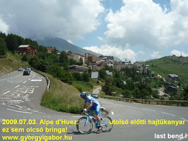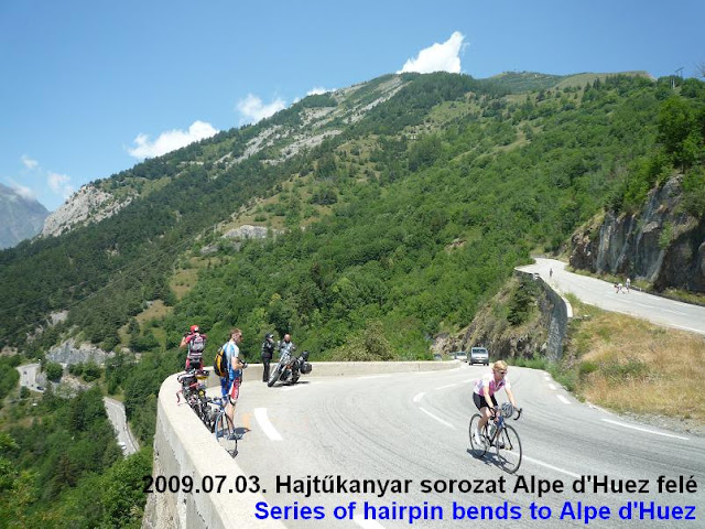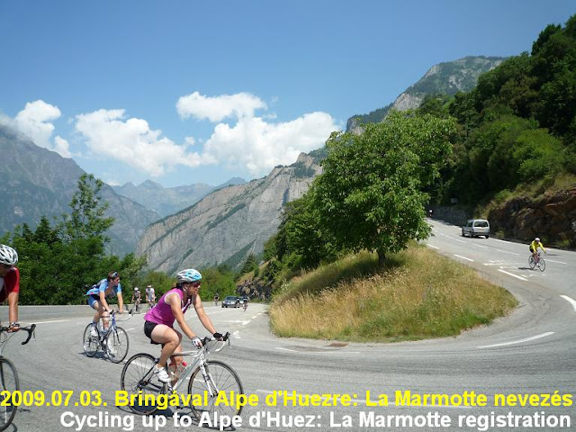 Alpe d’Huez-be a nevezést és rajtszám átvéptel miatt kellett felmenni. Csodás időben kezdtük meg az eleinte 10-12%-os meredekségű kilométereket, időnként már magasból néztünk le a kisvárosra.
