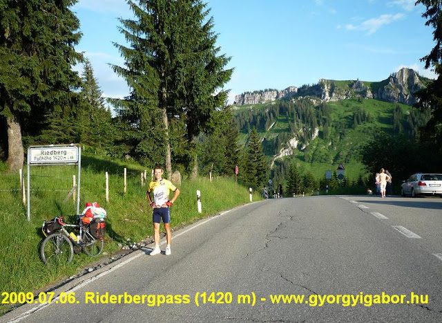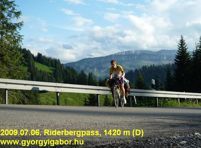 A Riderbergpass (1420 m) kaptatója hullámozva, időnként 14%-os meredeken, időnként röviden 6-8%-osan haladt felfelé, eleinte kilátás sem nyílt. Később is megmaradt a váltakozó meredekség, illetve egy panorámás útépítéses szakasz. A végső, 10-12%-os meredek résznél szép panoráma nyílt dél felé az osztrák határt jelentő hegyekre, így önmagamról is készítettem fotót és a meredeken videót is. A tetőn éppen csak fotóztam egyet, majd jöhetett a meredek ereszkedés.