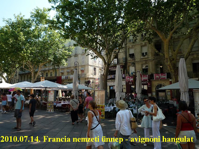 Bentebb a főtér felé akadtak karikaturisták is, élő szobrok (melyek pénzt adva nekik mozdultak meg) és itt-ott modern művészeti csoportok tartottak ilyen-olyan előadást. Egy fiatal bohóclányt el is kezdtem filmezni, de miután 2-3 percig nem történt semmi, csalódottan ballagtam tovább. Július 14-e volt, így sok turista, járókelő volt Avignonban.