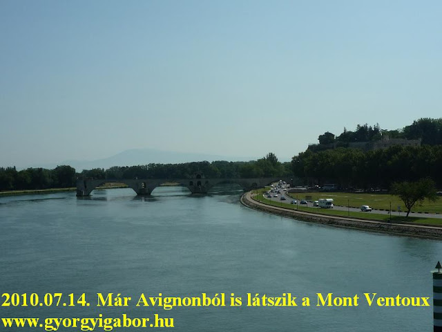 A folyópartra gurulva – mivel a forgalom csak a túloldalon haladt – csendes is lehetett volna, ám nyáron egész nap alapzajt nyújtanak a kabócák. A hídról is körbefilmezve a távolban - kissé párában - feltűnt az égbe törő Mont Ventoux (1909 m), amin még a TV torony is kivehető volt.