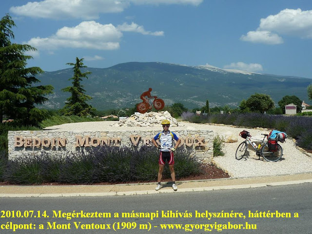 Carpentrastól kezdett enyhén emelkedni az út, itt már akadtak szőlőültetvények és végre közelebbről „szemezhettem” a Mont Ventoux-val, a provance-i óriással – ahogy hívják. Sietség nélkül, nézelődve haladtam, üdvözöltem visszatérőként az ismerős kanyarokat, útszéli keresztet, rövid emelkedőket és értem végül 15:40-re a Bedoin előtti levendulával díszített bringás alkotáshoz: egy fém bringás alatt + előtt nagy betűkkel volt az épített kőfalra írva: Bedoin - Mont Ventoux. Ez kötelező fotózó hely.