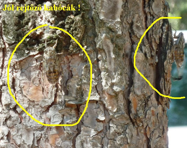 A sátorhelyek a hegyoldalban, fenyőfák közt voltak kialakítva, az én sátorhelyemről is klassz kilátás nyílt a dombságra és a strandra is. Alig, hogy letámasztottam a bringámat, jól észrevehetően fel is tűnt a fán 2 kabóca, amelyekről így klassz fotót készíthettem.