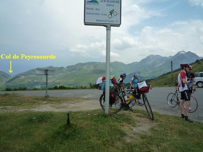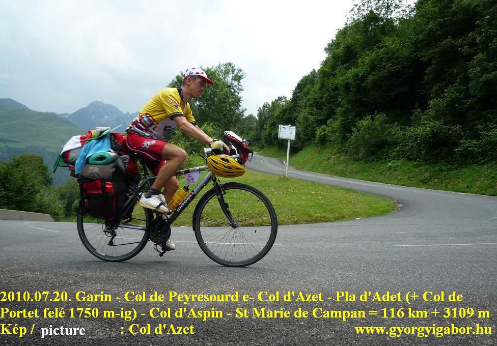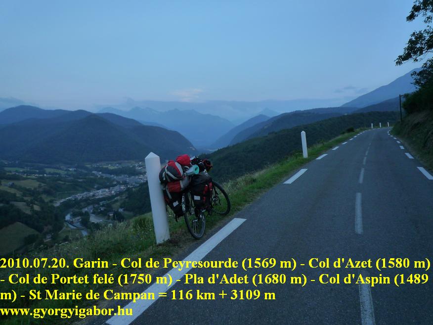 2010.július.20, kedd – 8. nap: = Garin (1120 m) – Col de Peyresourde (1569 m) – Genos – Col d’Azet (1580 m) – St Lary Soulan – Col de Portet felé, aszfaltos után 700m-rel (1750 m) – Pla d’Adet (1680 m) – St Lary – Arreau (710 m) – Col d’Aspin (1489 m) – St Marie Campan, kemping (847 m) = 115,65 km + 3062 m szint