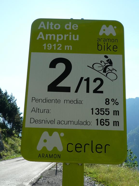 Emlékeim szerint 2010-es túrámon ez volt az első spanyol emelkedő, ahol - a Franciaországban természetesnek számító - bringásoknak szóló magasság és meredekségadatot tartalmazó táblákat tettek ki minden kilométer előtt. Cerler – Ampriu síközpont emelkedője (1915 m) a leágazástól mérve 12,8 km-es, az erre jutó 717 m szintkülönbség nem jelentene komoly meredekséget, ám leszámítva a lejtős, illetve sík részeket, az emelkedő kilométerei átlagosan 7,6%-osak. Noha az aszfaltos út csak 1912 – 1915 méterig vezet, ha már addig feljutok, szerettem volna legalább valami földúton 2000m fölé hajtani, ezért direkt kerestem és találtam is egy részletesebb gyalogtérképet, hogy aszerinti valamelyik úton még egy kicsit tekerhessek fölfelé.