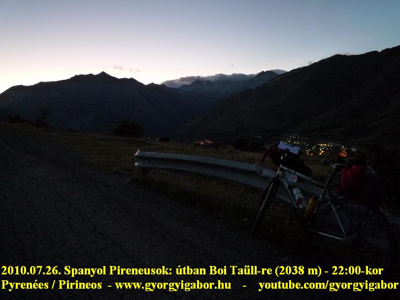 Egy élesebb hajtűkanyar után már a szomszédos hegyoldalban hajtottam; fák takarták egy ideg a kilátást, ám azután visszanézhettem a fénylő Taüllre és még a szemközti hegyek is látszottak; amögött ment le a Nap. Fentebb, 1850 méter táján (21:55) - ahonnan már tovább befelé haladt az út – az erős szürkületben legelésző lovak leptek meg; oly csöndesek voltak. Ezután vált igazán sötétté az emelkedő, tovább nem húzhattam a lámpa elővételét.