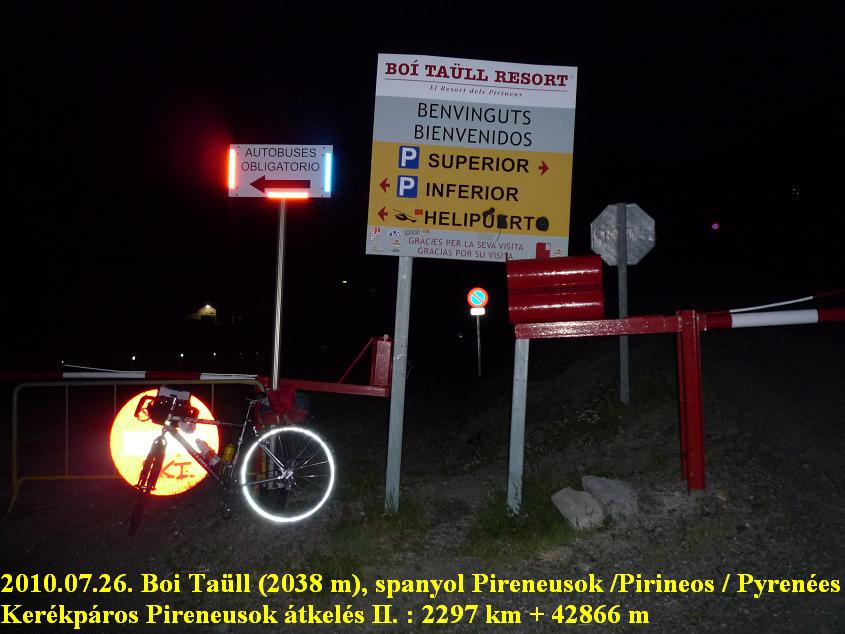 Ez itt is csak a magasságról szólt. Ráadásul ez a hegy sem BIG listás, mégis fontos volt nekem. Az utolsó 2-3 km-re sajnos romlott picit az út minősége, de ez már sem nem osztott, sem nem szorzott. Az utat lámpámmal világítva tettem meg, az utolsó kilométeren legalább viszont már fényekből láttam, hogy hol a cél. Egy sorompónál értem fel Boi Taüll síközpontba, 2038 m (22:25-35). Fotózást majd meleg ruhába öltözést követően jöhetett az óvatos lejtőzés; Boi Taüllbe érve végre kivilágított úton nagyobb fokozatba kapcsolva igyekezhettem vissza a kempingbe (kb. ¾ 12).
