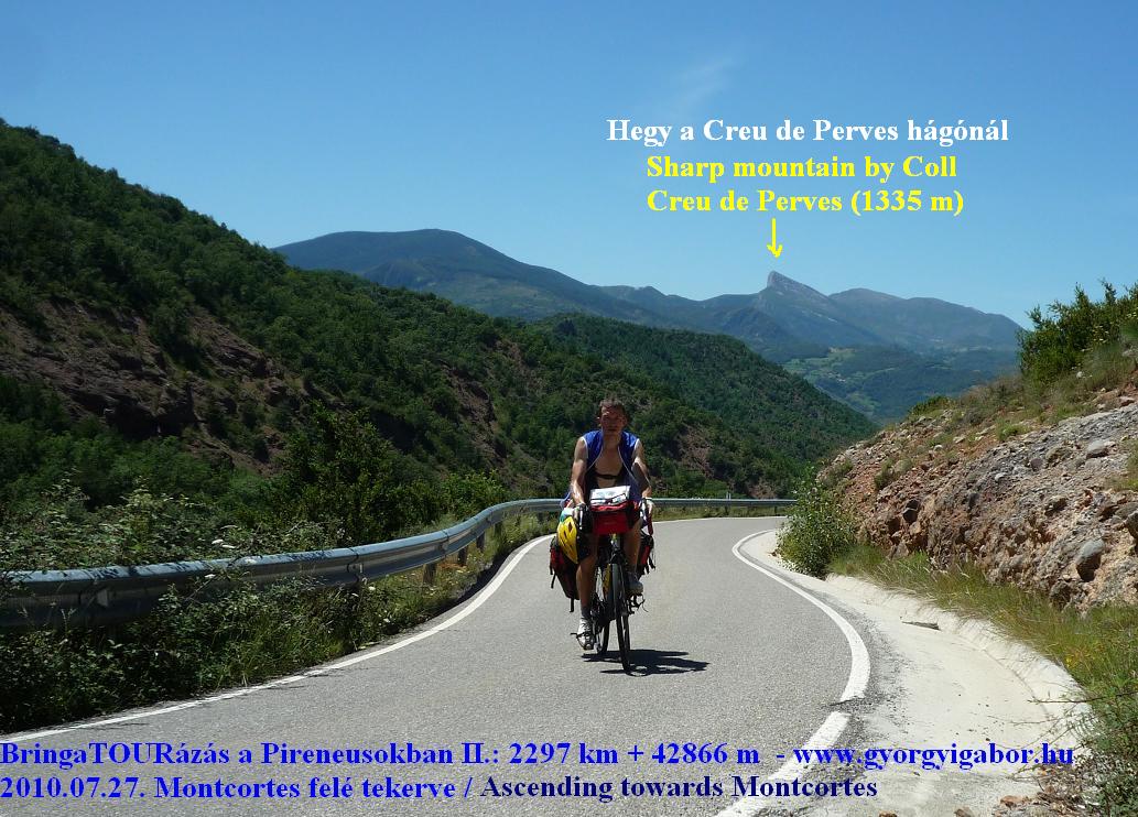 A tábla szerint 1334,9 m magas, füves, panorámás Creu de Perves hágó (12:25 – 40) emelkedője a kilátás, a barátságos táj, minimális forgalom miatt kifejezetten ajánlott hágóút. Lejtőjén délszakibb, szárazabb bozotósabb tájra érkeztem; az alattam látott kanyar mellett kb. 20 házból álló lakóközösség jelentett egy települést. Takaros volt