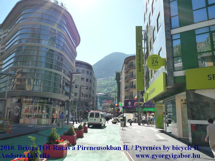 hogy az emlékek megmaradhassanak. Bizony Andorrában a folyó mindkét oldalán akad főút komoly, váci utcát idéző üzletekkel: akár divat, akár parfüméria, vagy elektronikai üzletek, ajándékboltok, bankok. Minthogy többször is barangoltam, nézelődve tekertem a városban, úgy tűnt: bankból és elektronikai üzletből van a legtöbb. Emlékezetből kerestem a turistairodát, ám úgy tűnt, átköltözött: most a folyó feletti hídon kapott helyet egy kisebb bódé szerű épületben, ahol internetcafé ügyben hamar kis térképet kaptam a megfelelő információkkal.