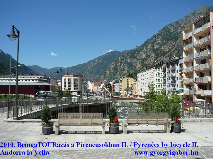 Andorra városba visszaérve ¾ 11-kor (22-23 fok) még volt ám élet: élveztem a szépen kivilágított épületeket, üzleteket, hidat, stb: jól esett ¾ órát is erre-arra tekeregni, nézelődni, magamba szívni esti hangulatát. Szép napot zártam; volt minek örülnöm (itt lent már felhőtlenül megtehettem), hiszen MEGLETT: bringával az összes andorrai 2000m fölé vivő aszfaltos úton jártam már! Még 2 spanyol és 2 francia volt hátra a Pireneusokban.