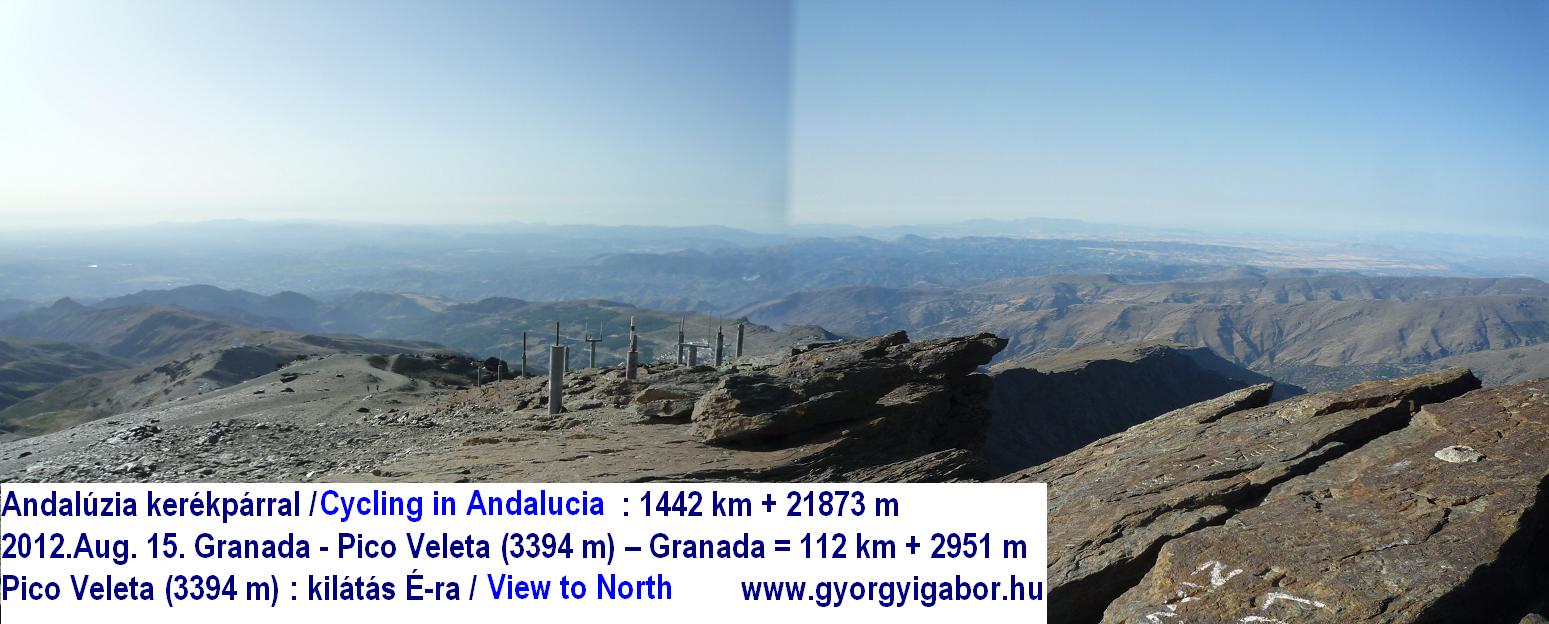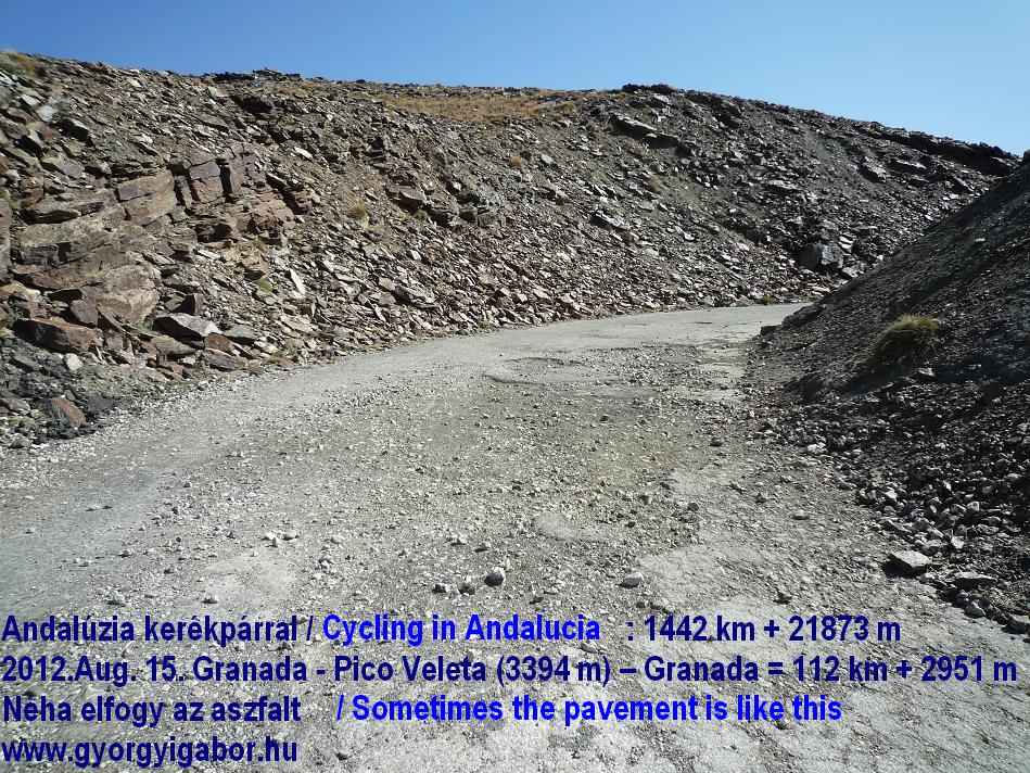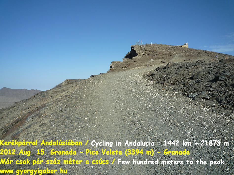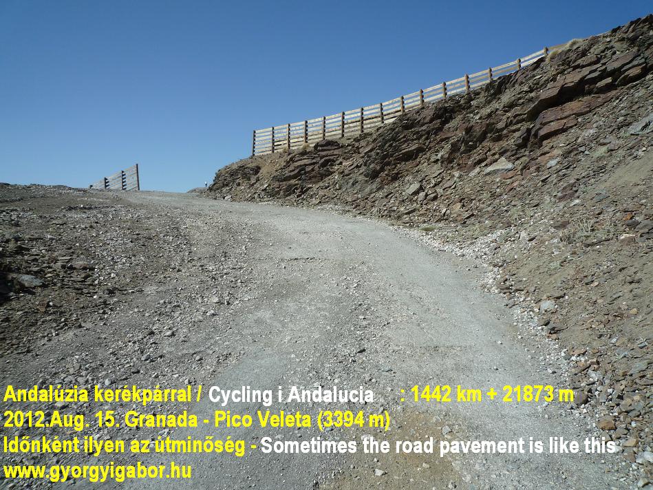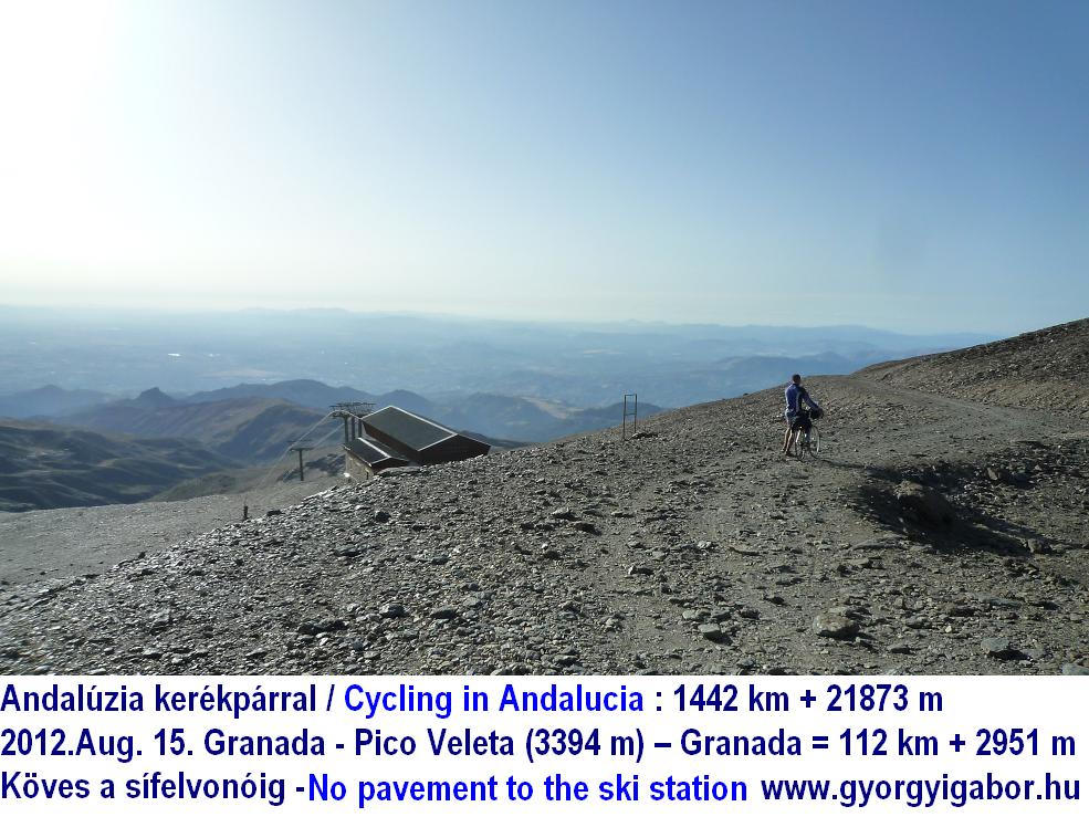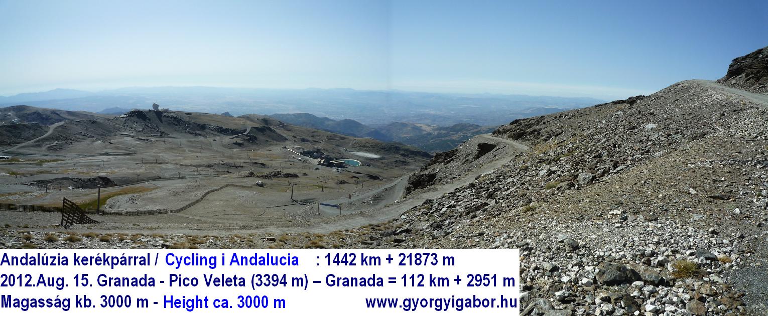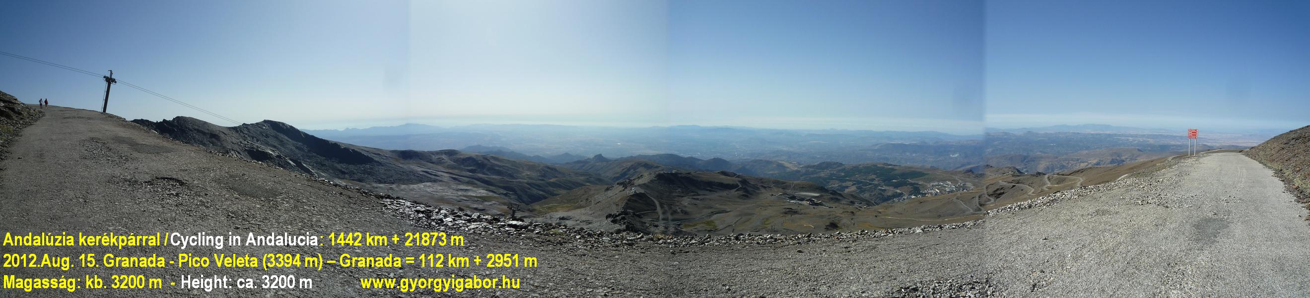 Kb. 3150 m magasan értünk fel a csúcs alatti gerincre, ahonnan még tovább bővült a Keletre nyíló kilátás, illetve be lehetett látni a függőlegesen leszakadó csúcs alatti katlanba. A sziklák alatt akadt pár kisebb hófolt. A szél annyira tombolt, hogy le is filmeztem, amint Tamás is jobbnak látta megállni kicsit, nehogy felborítsa. Bizony előfordult ilyen párszor, hogy jobbnak láttuk megállni és megvárni, amíg kitombolja magát a széllökés és csak utána folytattuk a pedáltaposást. Granada is nagyon mélyen (-2500 m) alattunk volt már, de már Sierra Nevada síközpontot is messze elhagytuk; szűk 1000 méterrel jártunk már fölötte.
