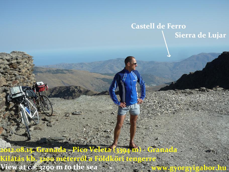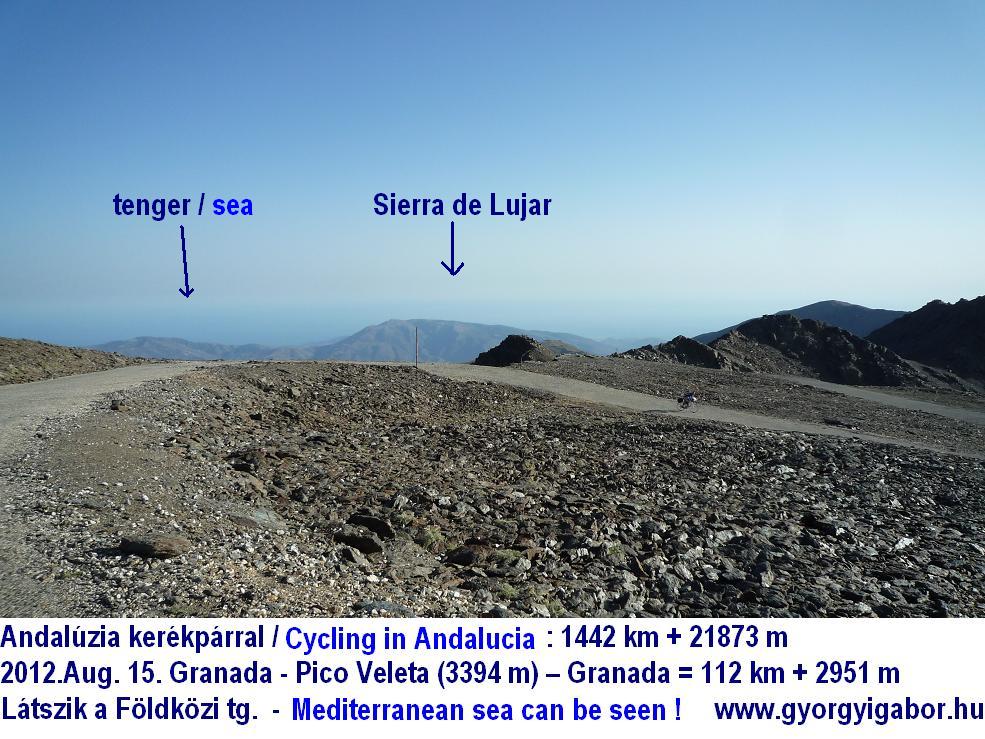 Ami a panorámát illeti, egészen az Almériától nyugatra fekvő mezőgazdasági síkságtól terjedt a kilátás a felfedezett Castel de Ferrón és Lujar hegyen és Motrilon át Malaga irányéba, de arra már oly homályos volt, hogy alig láttuk. Tamás azonban felismerte Gibraltárt és szembe vele Afrika partjainak szürkébb színét. A távolságot illetően, 150-200 km-re is elláttunk. Érdekes volt felismerni, hogy noha éjjel is eltekertem itt, akkor nem tűntek fel a tengerparti fények; csak fentebbről „gyönyörködtem”.