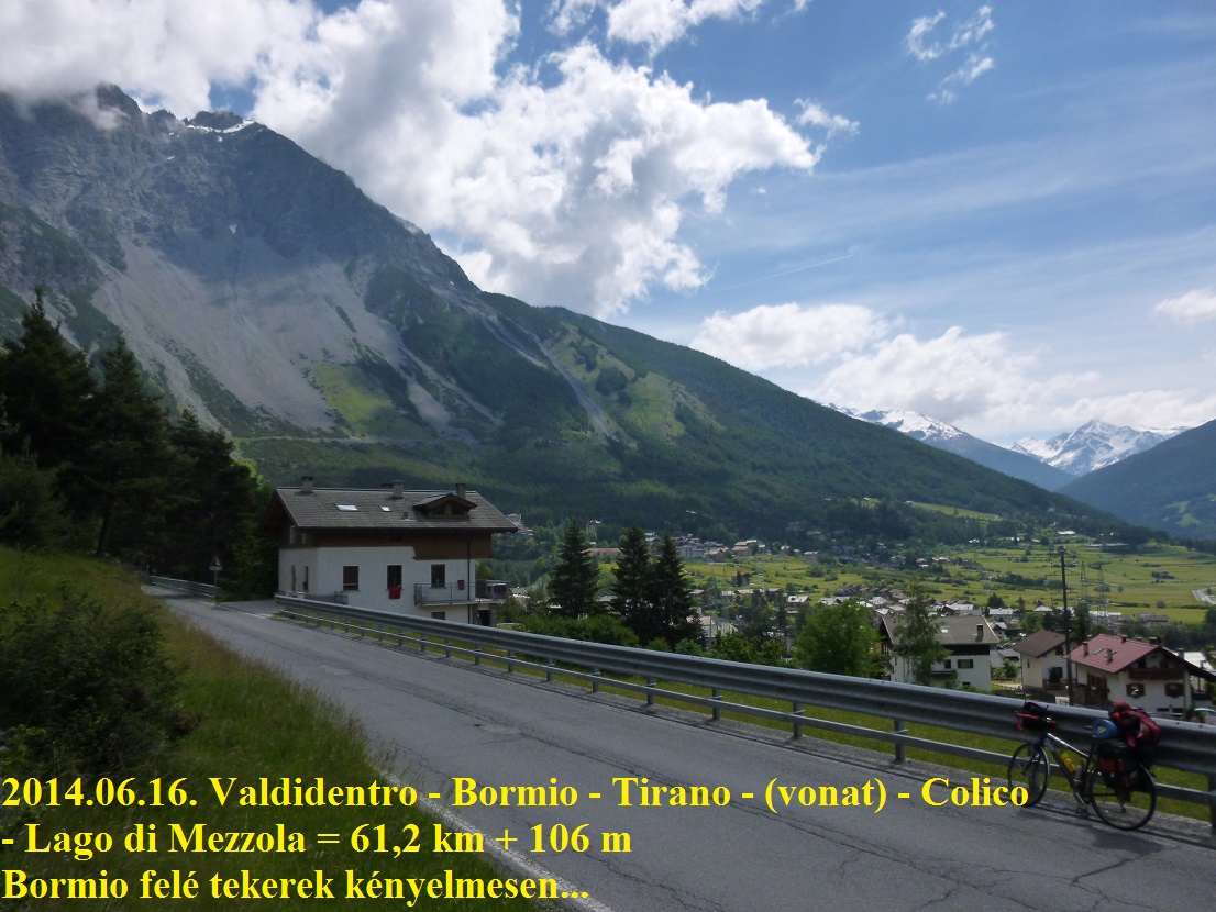 Figyelembe véve a Tiranóból Colicoba tartó vonat indulását, 17:30 körül, ellenszélben hagytam el a komoly hágóutak ölelésében fekvő Bormiot. Málhával tekerve néha kissé küzdelmes volt, ám az időnként gyors lejtők időlegesen felfrissítettek; szerencsére nem éreztem nyomottnak, vagy lomhának magam. Az időjárás nem volt túl bíztató: előrefelé esőszerű szürkeség várt rám. Nosztalgikus hangulatban ereszkedtem, hajtottam: előző nap kétszer is végigtekertem ezen a 40 km-es szakaszon, egyfelől felidéztem emlékeim, másfelől pontosan tudtam, melyik szakaszon mi vár rám: hol jön gyors lejtő, hol pedig unalmas, szinte sík kilométerek.